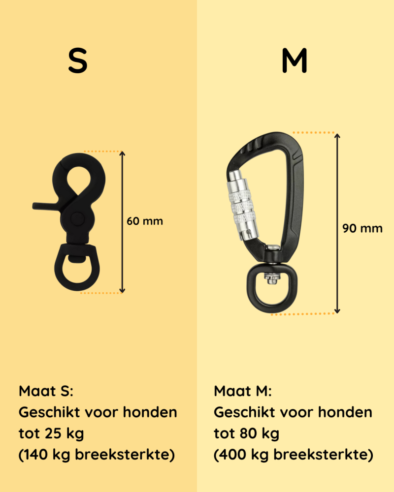 De karabijnhaak (M: zie afbeelding) heeft een breeksterkte van 400 kg. Met een veiligheidsmarge van 5× is deze lijn geschikt voor honden tot 80 kg.
